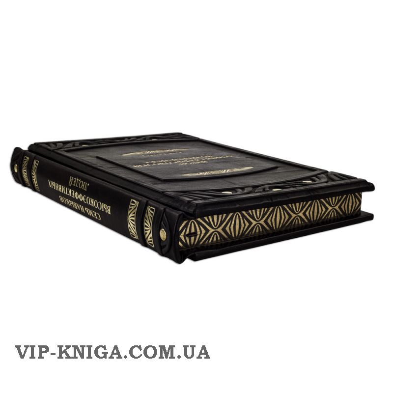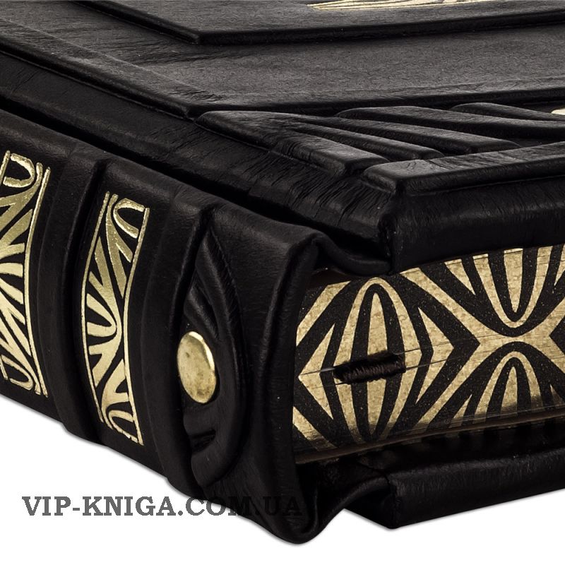 Оформление: составной переплет «Брадель», ручной работы, изготовлен из натуральной итальянской кожи теленка «Marrone». Обложка книг оформлена объемными узорами ручного тиснения, рельефным тиснением золотой фольгой «Luxor» в 24 карата, холитенами (цвет «Gold»), количеством 8 шт. Обрез книги выполнен в уникальной технологии художественной запечатки золотой основы.