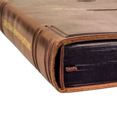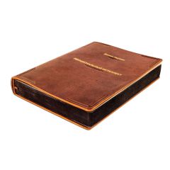 Оформление: цельнокожаный полужесткий переплет «Брадель», ручной работы, изготовлен из натуральной кожи POSITANO Vegetale производства итальянской кожевенной фабрики. Обложка книги оформлена комбинацией глубокого блинтового и рельефного золотого тиснения, с использованием фольги “Luxor 240”. Обрез блока вручную шлифован и окрашен.