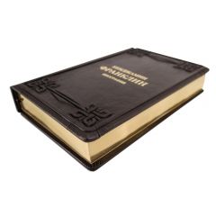 Оформление: составной переплет «Брадель», ручной работы, выполненный из натуральной кожителенка «Marrone» производства итальянской кожевенной фабрики «Carisma». Обложка книги оформлена объемными узорами ручного тиснения и рельефным золотым тиснением, c использованием фольги «Luxor 240». Обрез вручную полирован и позолочен.