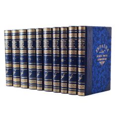 Оформление: сочетание темно-синей натуральной кожи (Италия), ткани, тиснения и позолоты – придает роскошный и изысканный образ каждой книге. Вместе все десять книг на полке создают атмосферу аристократической библиотеки ХVIII-XIX века.