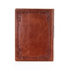 Обложка: натуральная коричневая кожа, золотое тиснение, объемное тиснение, вставки из черной кожи, позолоченный обрез