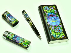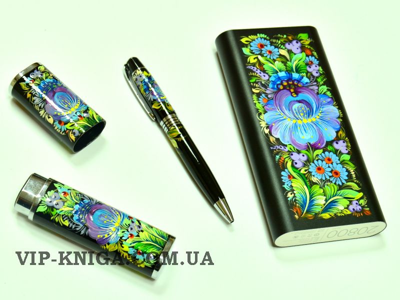 Стильный подарочный набор в коробе с бархатным ложементом внутри включает в себя: металлическую ручку в футляре (производство Польша), Power Bank емкостью 20800mAh. Ручка, футляр и Power Bank расписаны мастерами подлаковой росписи международного класса (ручная работа). Каждый элемент данного сувенира это произведение технического и художественного искусства.