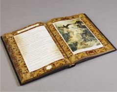 Оформление: Переплет французский цельнокожаный, ручной работы. Кожа цвет эбен (Италия). В середине гравированная композиция, цвет золото. Каптал шелковый, ручного плетения. Форзац составной. Рельеф, тиснение. Обрез полированный цвет золото.