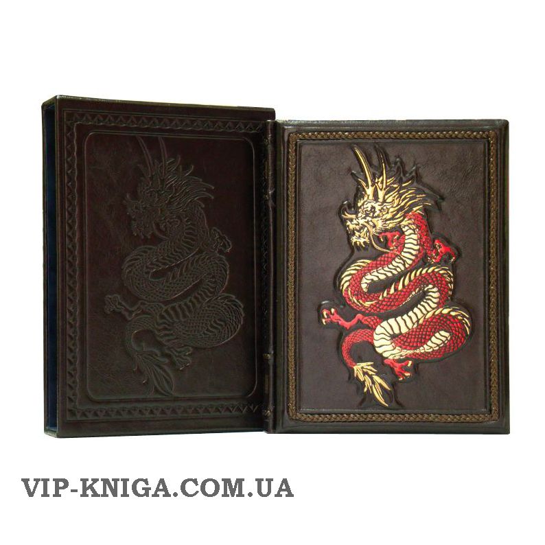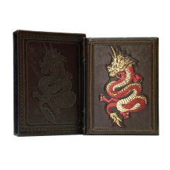 Оформление: Эксклюзивный дизайн в восточном стиле, кожаный переплет ручной работы (кожа сорта Fiorra, тиснения "крокодил", Италия) инкрустированный камнями циркон ювелирной огранки общим количеством 4 шт., камнями нефрит количеством 4 шт., камнями зеленый «кошачий глаз» количеством 3 шт., художественное литье «китайский дракон».