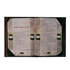 Оформление: Переплет французкий цельнокожаный, ручной работы. Кожа цвет: коричневый, декоративные вставки цвет:" бордо" и цвет "лазурно-синий". (Италия). Рамка с орнаментом, название - гравировка цвет "золото" и "серебро". Каптал шелковый, ручного плетения. Форзац составной. Обрез полированный, окрашенный вручную, цвет "золото". Техники в изготовлении переплета: гравировка, высокий рельеф и тиснение по коже.