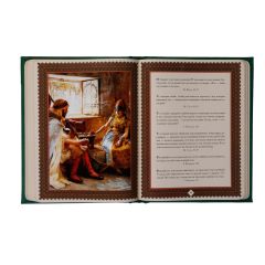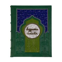 Оформление: переплет французский цельнокожаный, ручной работы. Кожа цвет "темно-зеленый" (Италия), а также вставка из кожи цвета "весенне-зеленый" и "синий" (Италия). Рельеф на коже и тиснение выполнены вручную. Круглёные корешки книг украшают высокие бинты. Обложка декорирована композицией - гравировка, цвет - "серебро" инкрустированная кристаллами Swarowski . Каптал шелковый, ручного плетения. Форзац составной. Обрез полированный, цвет - "золото".