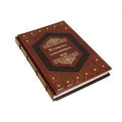 Кожаный переплет ручной работы, выполнен из лучшей натуральной кожи («Notingen Cnoco» и «Plonge Braun») производство Италия. Обложка книги и корешок оформлен рельефным золотым тиснением (фольга ), узорами ручного тиснения и латунными халитенами общин количеством 16 шт. Форзац «Majestik casino gold» производство FAVINI N.V. Голландия. Французский составной переплет.