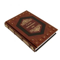 Оформление: кожаный переплет ручной работы, выполнен из лучшей натуральной кожи («Notingen Cnoco» и «Plonge Braun») производство Италия. Обложка книги и корешок оформлен рельефным золотым тиснением (фольга ), узорами ручного тиснения и латунными халитенами общин количеством 16 шт. Форзац «Majestik medal bronze» производство FAVINI N.V. Голландия. Французский составной переплет. Сертификат.