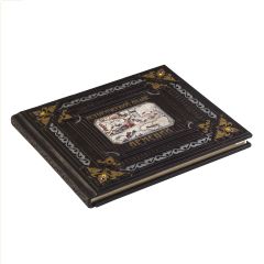 Оформление: переплет французский цельнокожаный ручной работы. Кожа темно-коричневого цвета (Италия). В центре - художественная композиция с кожаной вставкой, обрамление – гравировка инкрустированная кристаллами Swarovski, цвет - "золото" и "серебро". Каптал шелковый, ручного плетения. Форзац составной. Обрез полированный, цвет - "золото".