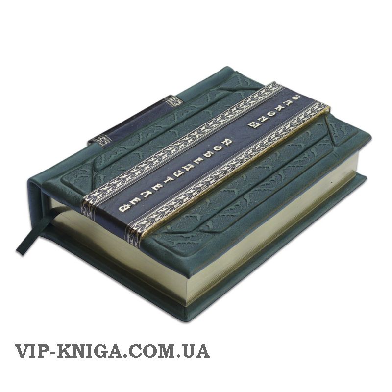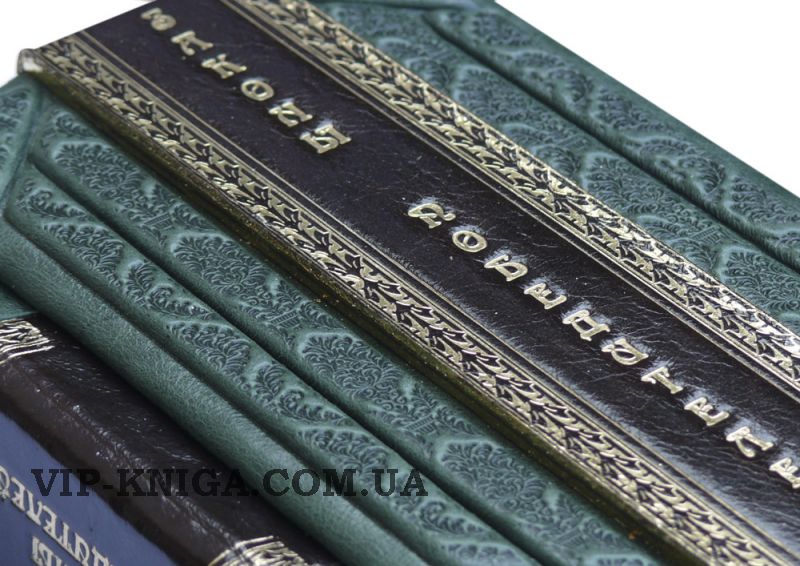 Оформление: французский составной переплет ручной работы выполнен из комбинации натуральной кожи (кожа теленка «Robbat Wisky», кожа «Smeraldo scuro» производства итальянской кожевенной фабрики Carisma»). Обложка книги двухуровневая, оформлена комбинацией многоуровневого объемного тиснения: рельефного золотого, c использованием фольги «Luxor 240» и глубокого блинтового. Обрез вручную полирован и позолочен сусальным золотом.